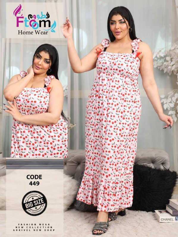 القَصّة واسعة ومريحة تلائم المقاسات الكبيرة (Big Size) وتناسب التلبيس حتى 130 كيلو، مع كشكشة رقيقة أسفل الفستان وحمالات بعقد مميزة تضيف لمسة ناعمة.
